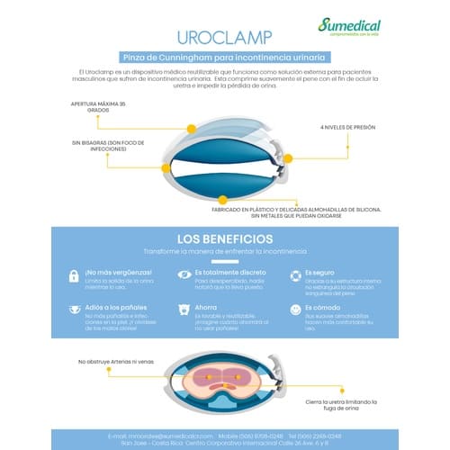 Indicado para hombres con incontinencia urinaria post-prostatectomía o secundaria a otras condiciones urológicas. El Uroclamp® no requiere procedimientos quirúrgicos y puede colocarse y retirarse fácilmente por el mismo usuario o un cuidador capacitado.